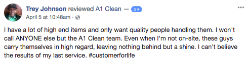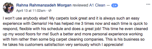Along with his military and corporate experiences he has transformed A1 Clean into a household name that provides great quality at affordable prices to everyone. It started as a one-man operation with a single portable carpet cleaning machine and a focus on providing exceptional customer service, along with the best carpet cleaning experience possible. After six months in operation, DeMario purchased a trailer-mounted carpet cleaning machine and the business took off.